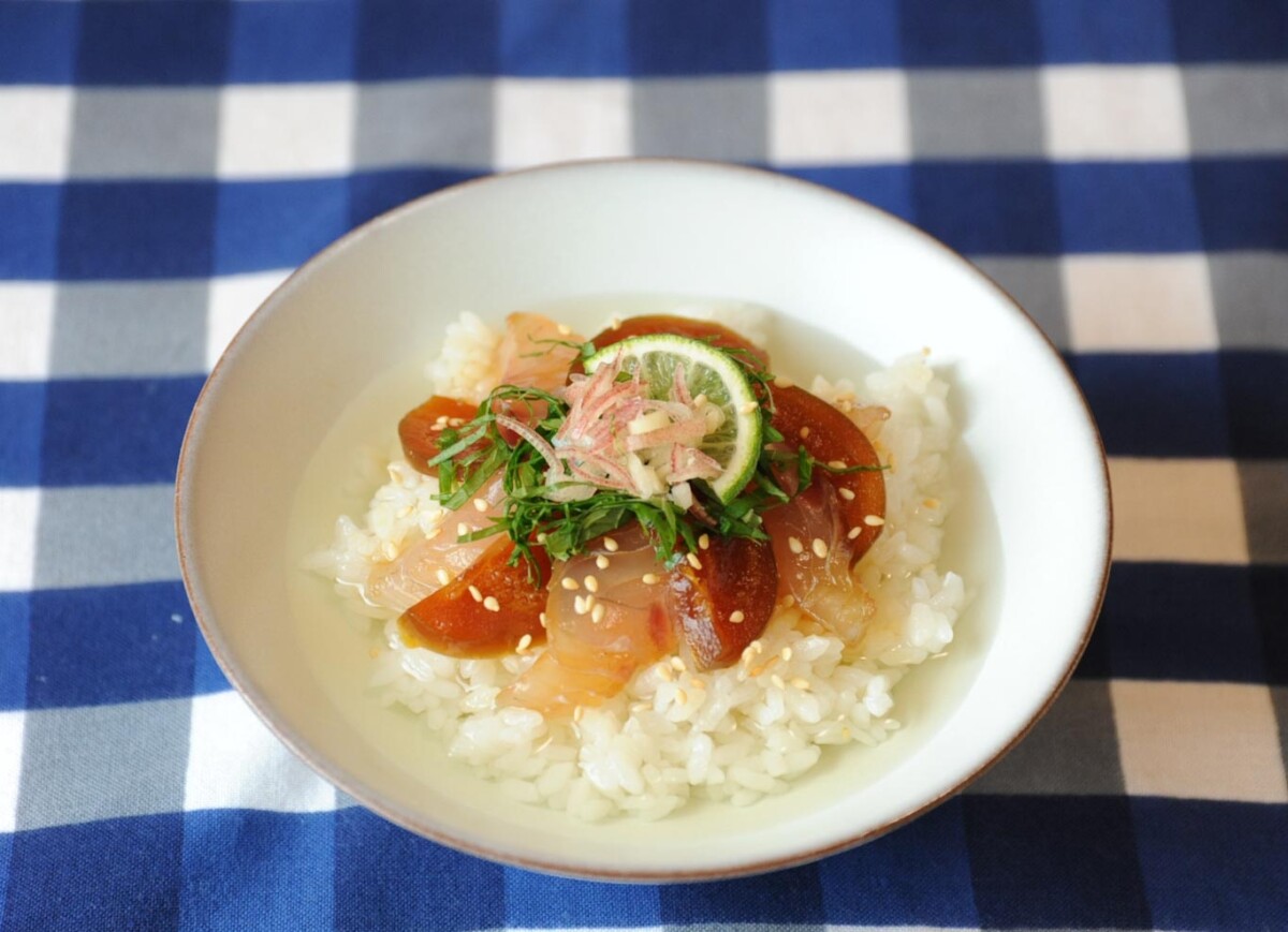 味噌漬け入り鯛茶漬け 材料(2人分) 鯛 100g ごはん 300g 茄子の味噌漬け 30g 大葉 4枚 みょうが 1/2個 白胡麻 適量 醤油 大さじ1 みりん 大さじ1 すだち 適量 出汁 300g 白だし 大さじ1/2 < 作り方> 1. 醤油とみりんを合わせる。 2.鯛を薄切りにして、1と合わせて10分ほど漬ける。 3. 茄子の味噌漬けを薄切りにする。 4.大葉は千切り、みょうがはみじん切りにする。 5.だし汁に白だしを加える。 6.茶碗にご飯をよそい、漬けた鯛と茄子の味噌漬けをのせ、大葉、みょうが、白ごまをのせる。 7.5の出汁をかけて出来上がり! |