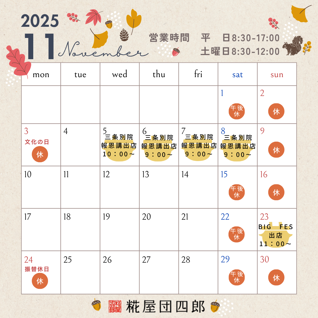 2025.11.06お知らせ 11月の営業カレンダー Tweet Share RSS お知らせ 2025-2026手作り味噌イベント 募集開始しました! 関連記事一覧 「味噌仕込みの一日」動画をつくりました。 8月の営業カレンダー 5月2日(金)の『ザワつく!金曜日』に、団四郎の『二十... 和釜新調プロジェクト クラウドファンディングに挑戦... 味噌イベントの日程が決まりました 仕込味噌のご予約は3月31日で終了となります。ご興味の...