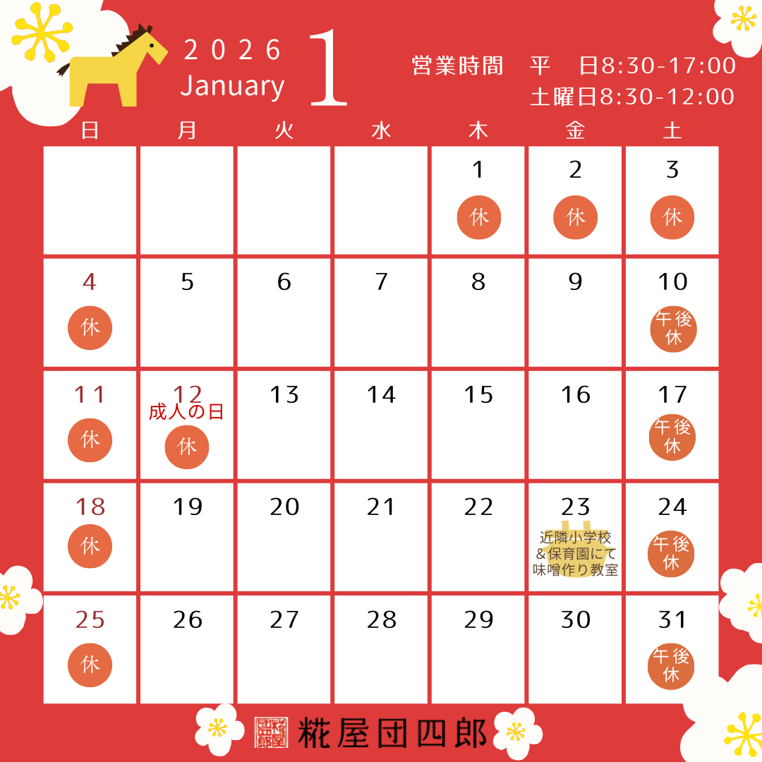 2025.12.26お知らせ 1月の営業カレンダー Tweet Share RSS お知らせ 年末年始休業のお知らせ 『仕込味噌』のご予約受付を開始いたします。 関連記事一覧 レシピを更新しました(二十年味噌の甜面醤) レシピを更新しました(海老とキャベツの塩糀サラダ) イベント出店のお知らせ 年末年始休業のお知らせ ふるさと納税の返礼品になりました 2023-2024 味噌イベントの日程が決まりました!